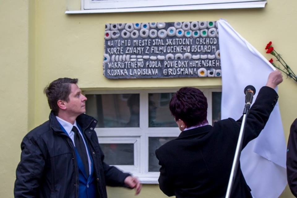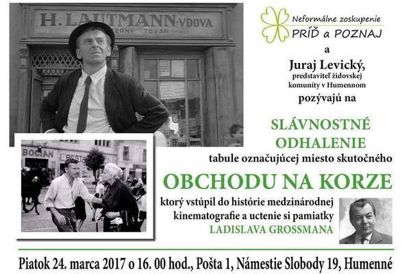 Neformálne zoskupenie Príď a poznaj, ktorí Humenčanom netradičnou formou pripomínajú aj menej známe fakty z dejín mesta Humenné, upozornili aj na miesto, kde skutočne kedysi stál obchod na korze, ktorý bol aj sfilmovaný a ocenený Oscarom. Podujatie sa konalo 24. marca 2017. Dôležitého partnera pre dané podujatie predstavoval Juraj Levický, predstaviteľ miestnej židovskej komunity. V jeho rodinnom dome sa uchoval dôkaz o tom, že obchod, ktorý vstúpil do histórie svetovej kinematografie, stál na mieste súčasnej humenskej pošty. Slávnostne bola odhalená originálna plastika, ktorej autorom je známy sochár Fero Guldan. Súčasťou podujatia bolo vystúpenie miestneho spevokolu a tiež čítanie ukážky z Grosmanovej knižky a uctenie si jeho mena pri pamätnej doske na budove kultúrneho domu.
