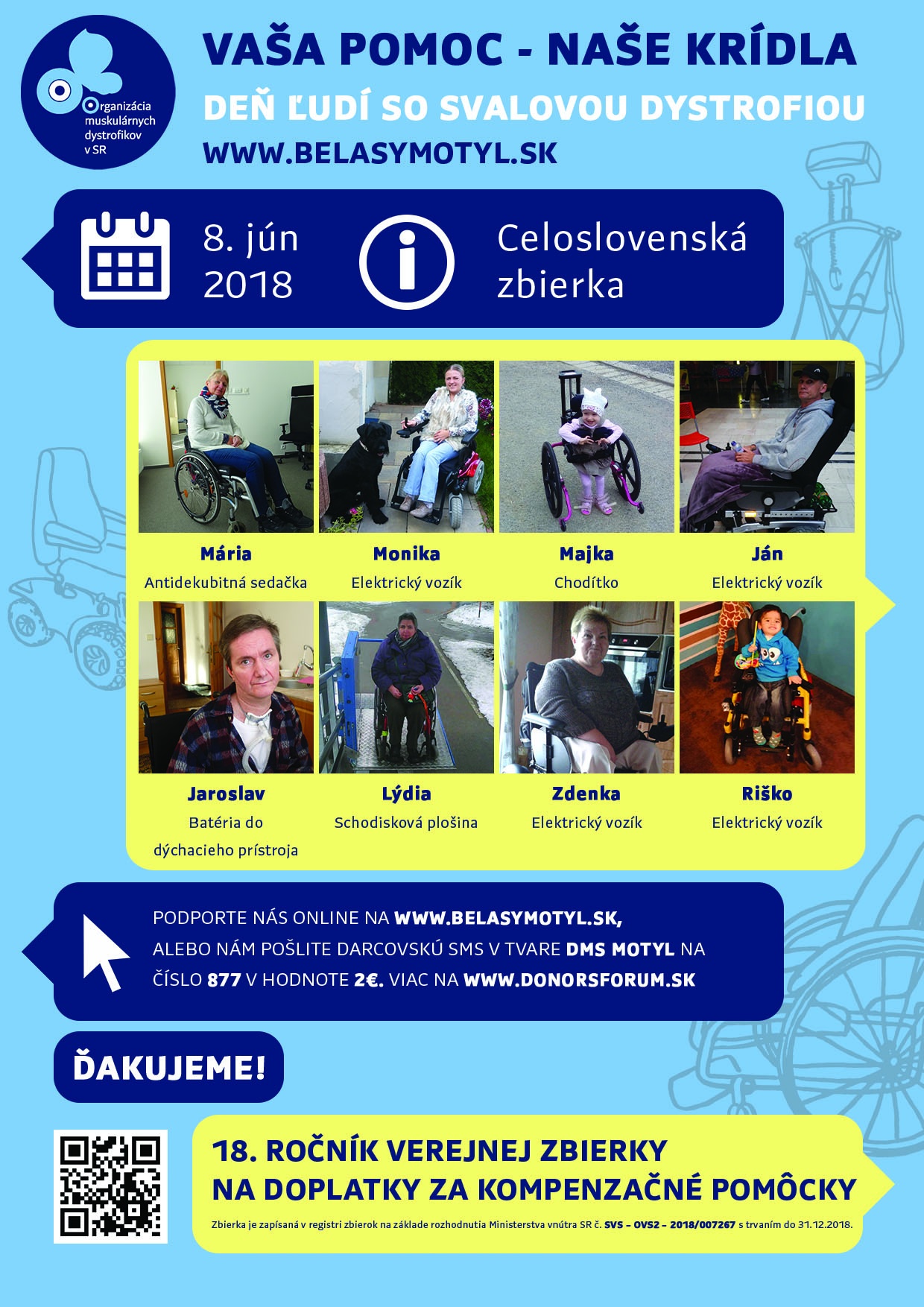 8. júna sa uskutoční už 18. ročník Dňa ľudí so svalovou dystrofiou. V tento deň sa vo vyše 60-tich mestách uskutoční spolu s osvetou aj celonárodná verejná zbierka, ktorá je povolená Ministerstvom vnútra pod číslom SVS – OVS2 – 2018/007267